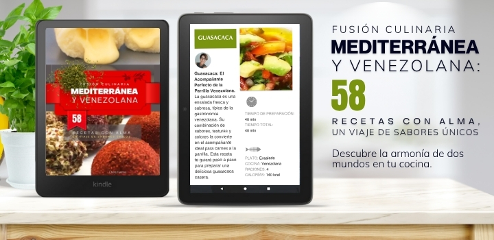 Esta deliciosa receta de guasacaca es solo una de las 58 historias de sabor que he creado en mi libro «Fusión culinaria mediterránea y venezolana». Si te gustó esta, te encantarán las demás. Lleva tu cocina a cualquier lugar, ya que puedes disfrutar de este libro en tu Kindle, tablet o móvil. ¡Consigue tu copia y explora el resto de la colección!