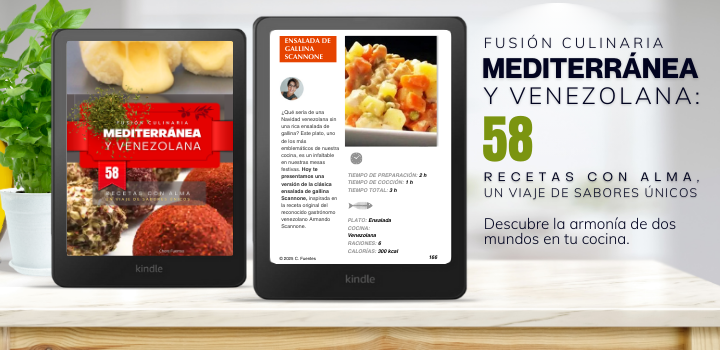 Esta deliciosa receta de Ensalada de Gallina es solo una de las 58 historias de sabor que he creado en mi libro «Fusión culinaria mediterránea y venezolana». Si te gustó esta, te encantarán las demás. Lleva tu cocina a cualquier lugar, ya que puedes disfrutar de este libro en tu Kindle.
