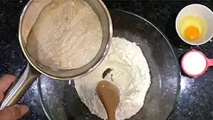 Luego, en un recipiente colocamos la harina, abrimos un espacio en el centro y agregamos la levadura fermentada, la leche, el huevo ligeramente batido y la sal.