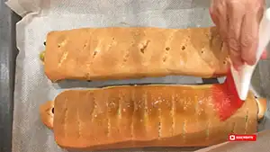 Pasados los primeros 20 minutos, abrimos el horno, y barnizamos los panes con el huevo y el papelón rallado.