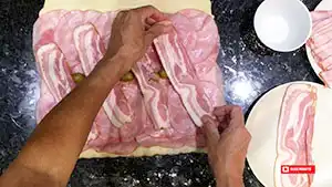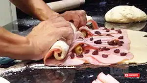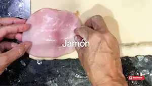 Comenzamos colocando el jamón en capas sobre las aceitunas cubiertas y qué sobresalga en los extremos, para que el jamón este presente en ambos extremos del pan.