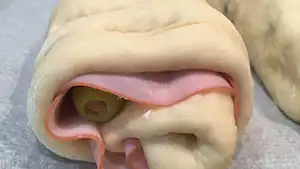 Colocamos las aceitunas separadas a dos dedos de distancia del borde, una al lado de la otra, en fila, esto es para asegurarnos que nos queden en el centro del pan y también al picarlo siempre tengamos aceitunas. Cubrimos las aceitunas con el borde de masa.
