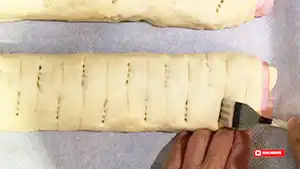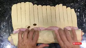 Al llegar al espacio sin relleno, lo humedecemos con un poco de agua para que se pegue y no se abra la masa al hornear, los cortes que observas en la foto son opcionales, también puedes dejarlo liso sin cortes.