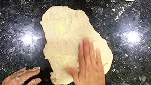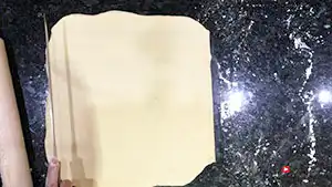 Extendemos la masa primero con las manos y luego nos ayudamos con un rodillo, tratamos que quede de medio centímetro de espesor y de forma rectangular, nos ayudamos cortando con un cuchillo los bordes.